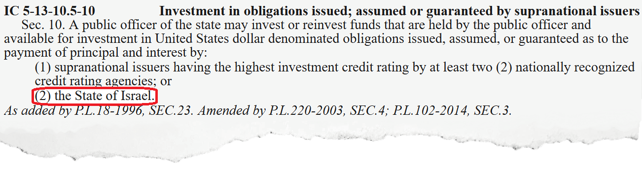 While Indiana law generally limits state investments in foreign bonds to those with the highest credit rating, the statute makes a special exception for low-rated bonds from the State of Israel.
